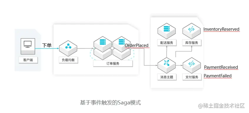 前面的商品页面虽然复杂,但是所有的操作都是读操作,聚合服务 API 是无状态、同步的。我们来看一下电商中的一个核心场景——订单流程。