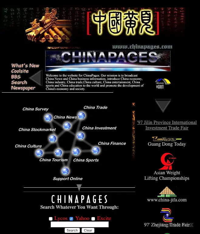 静态站点的业务需求是比较简单的,它相当于一个信息展示的站点。比如早期网站都是静态展示,如图是1997年的中国黄页,它其实就是一个单层的页面。其特征可以分为三点: