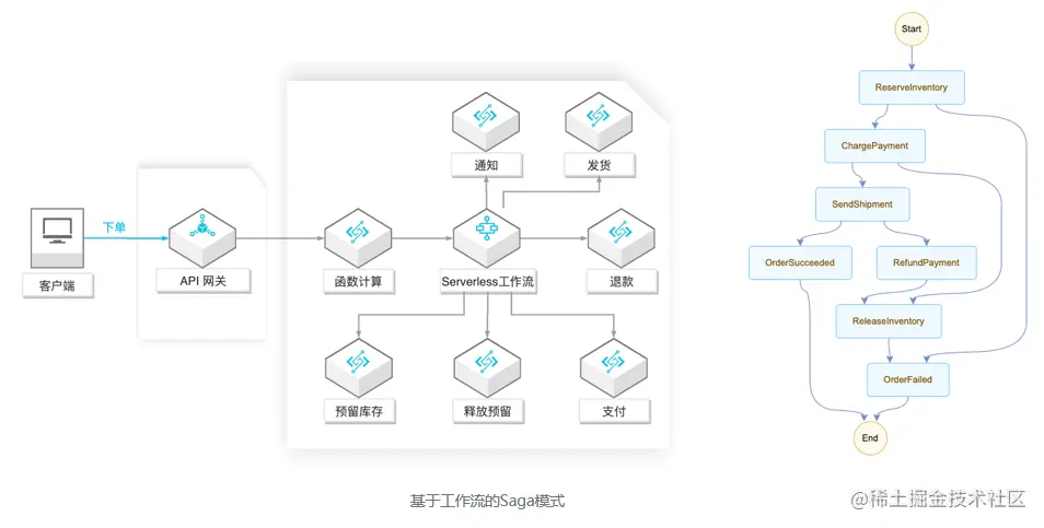 在这个 Serverless 架构里,各个服务直接是独立的,也不通过事件传递信息,而是有一个集中的协调者服务来调度单个业务服务,业务逻辑和状态由集中协调者维护。从网关层下单后,触发函数计算的一次函数执行,函数执行的逻辑会触发一个工作流的执行。就比如说右边这张图其实就是用户自己去编写的,这个流程,就是工作流。