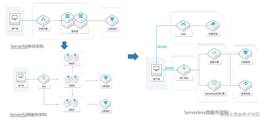 关于架构的演进,经历了 Serverful 单体架构到 Serverful 微服务架构再到 Serverless 微服务架构过程。随着业务的发展,组织规模的不断增大,这时候一般就需要将单体应用中的逻辑拆分成多个执行单元,比如商品页面上的评论信息,售卖信息,配送信息等都可以对应一个单独的微服务;而右图的架构引入了API网关、函数计算或SAE来实现计算层,将大量工作交换云服务完成。Serverless 这种微服务架构的好处是每个单元都能高度自治,单元之间松耦合,易于开发(比如使用不同技术)、部署和扩展。