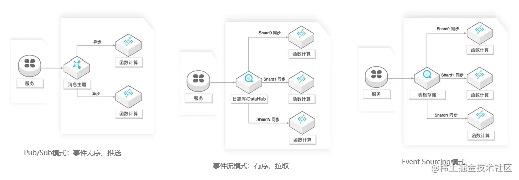 将架构演进再延伸一下,事件触发能力是 FaaS 非常重要的特性,这种 Pub-Sub 事件驱动模式不是一个新的概念,但是在 Serverless 流行之前,事件的生产者,消费者,以及中间的连接枢纽都是用户负责的,就像前面架构演进中的第二个架构。Serverless 让生产者发送事件,维护连接枢纽都从用户职责中省略了,而只需关注消费者的逻辑,这是 Serverless 的价值。函数计算服务还集成其它云服务事件源,让你更方便的在业务中使用一些常见的模式,如 Pub/Sub,事件流模式,Event Sourcing 模式。