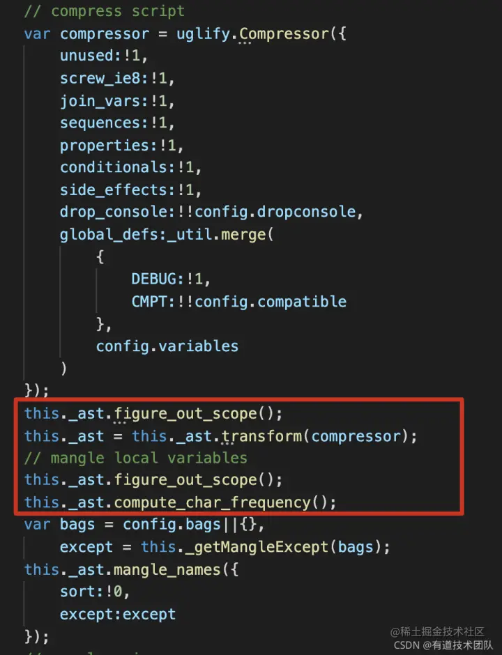 - 对且仅对这一个AST进行Uglify压缩混淆(源码的lib/adapter/script.js的parse)