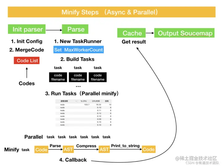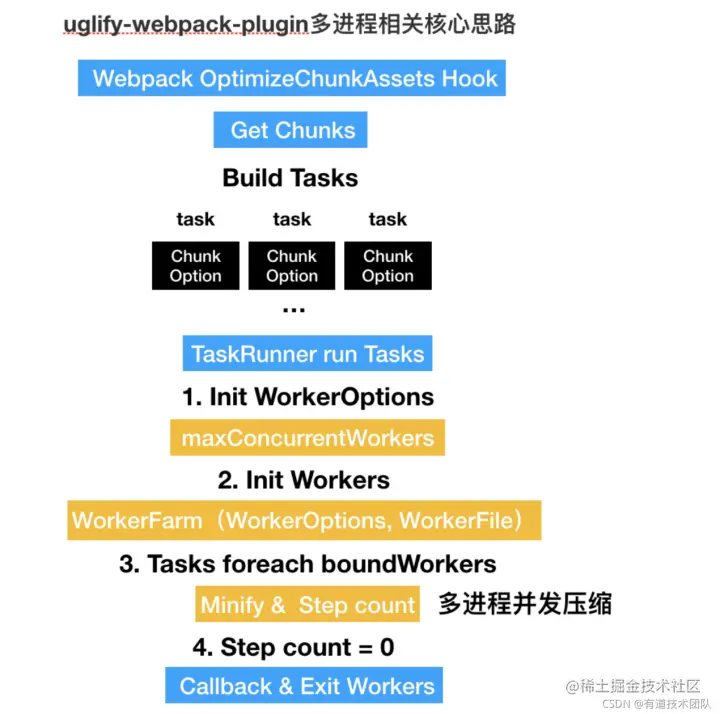 - 不对ast做concat操作,每个文件单独uglify。 2. 参考uglify-webpack-plugin插件的多进程思路,将每个文件作为task,并发打包。 (我又去看了一下uglify-webpack-plugin的源码,做了一张图,毕竟知己知彼才能顺利改造。)