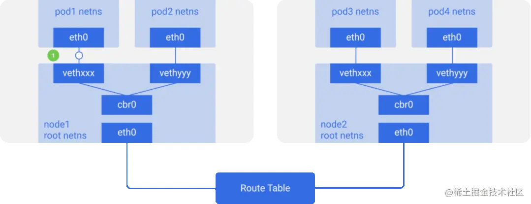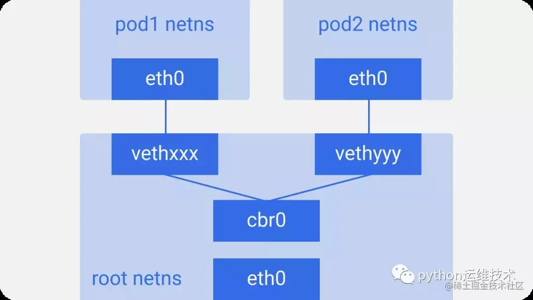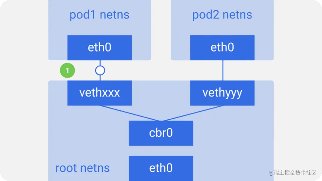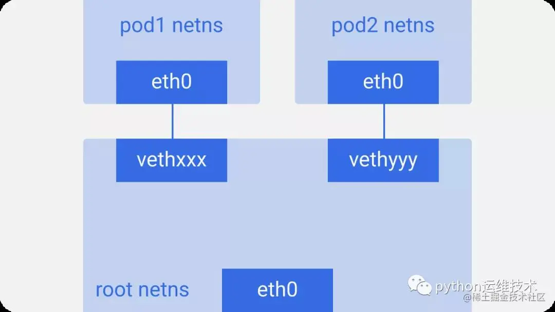 我们将Pod-end命名为eth0,因此Pod不了解底层主机,并认为它具有自己的根网络设置。另一端的名称类似于vethxxx。