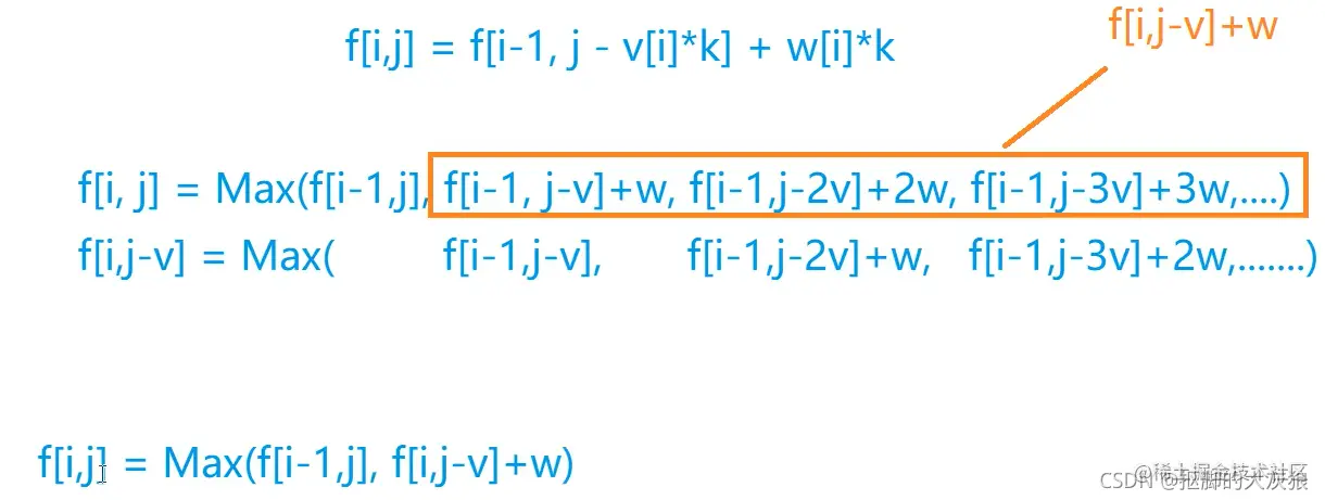 首先,还是按照完全背包的优化思路,推导一下状态转移方程:(下面用 v来代表 v[i],w代表w[i],s代表s[i])