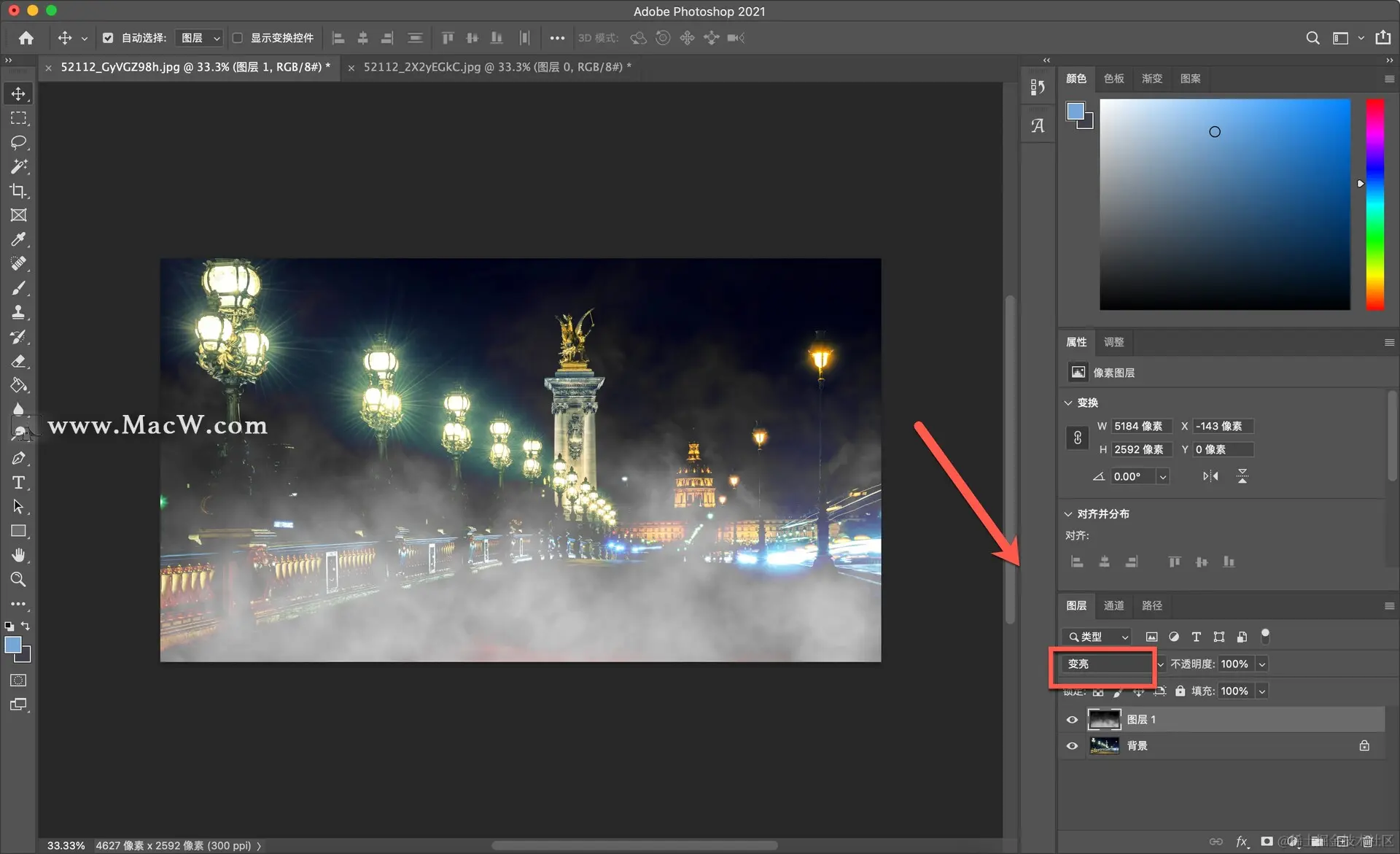 设置混合模式,小编选择变亮效果,因为此混合模式可以隐藏烟雾图层的黑色背景,使烟雾与场景更好地融合。降低烟雾图层的不透明度,对效果进行微调。
