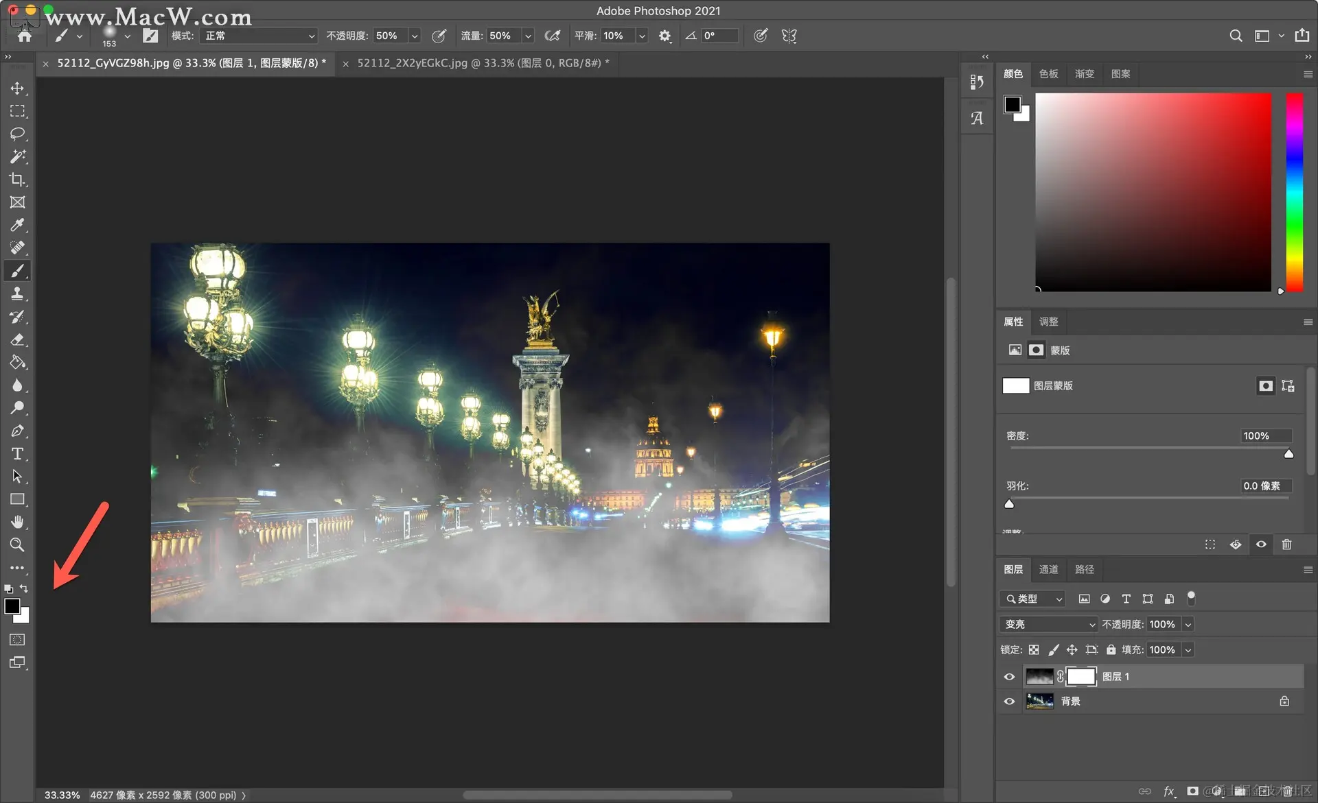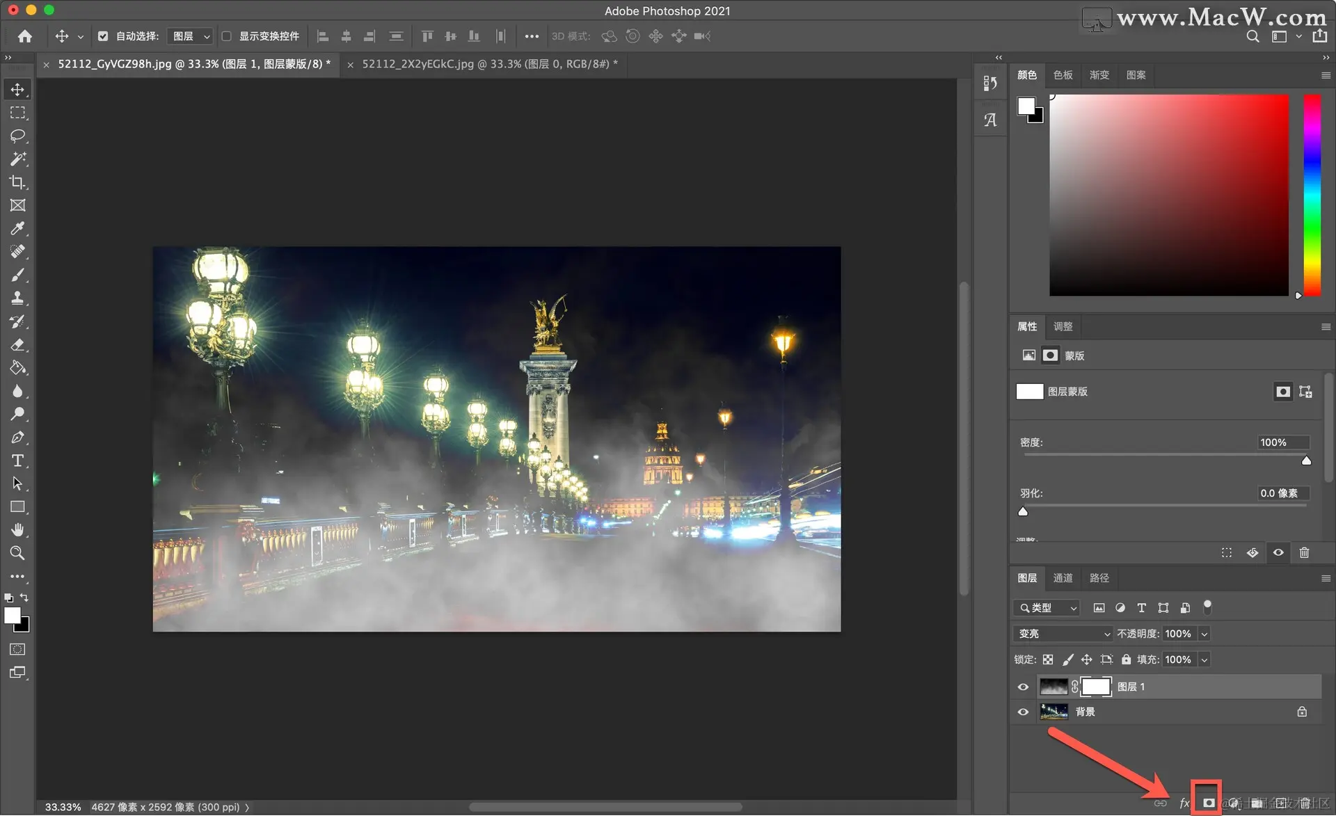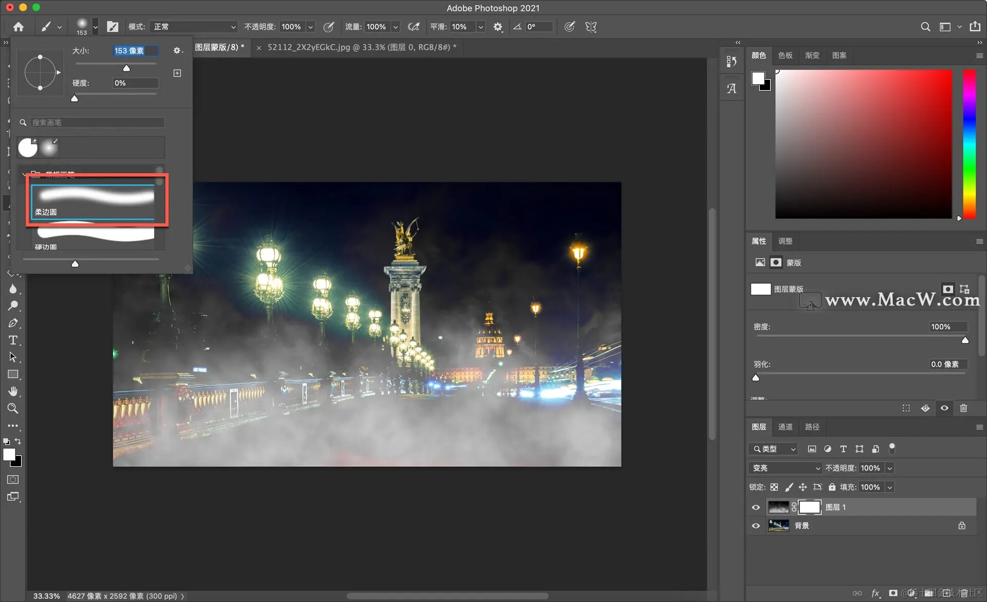 在合成图像的某些区域,烟雾外边缘看起来有些过于锐利,因此在烟雾图层上添加一个矢量图层蒙版。