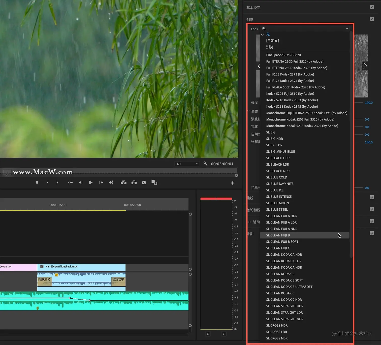 在基本校正下方的创意中,可以为视频添加各种LUT预设,点击look可以看到不同的预设