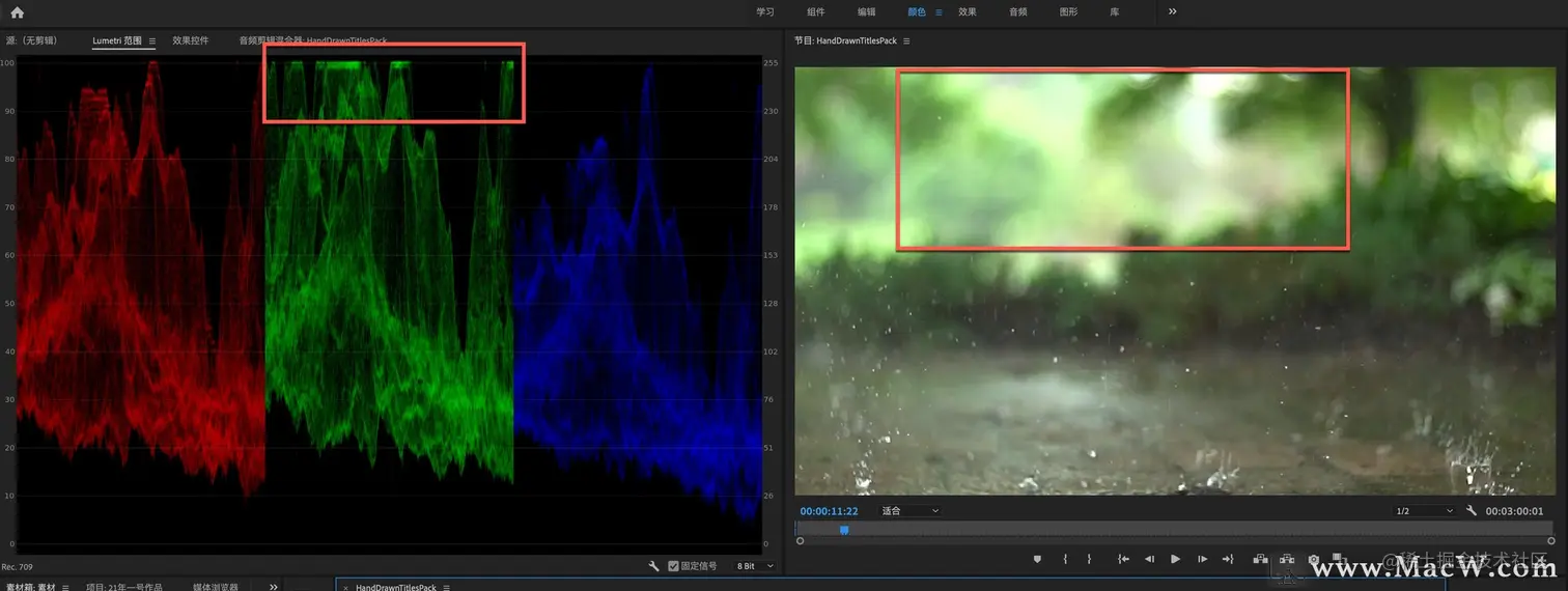红、绿、蓝分别对应三个通道的颜色,最下方为0,显示的是画面中最暗的区域,最上方是100,对应的是最亮的区域,在视频素材中可以看到,比较亮的区域是绿色比较多,对应的绿色通道数值会相对较大