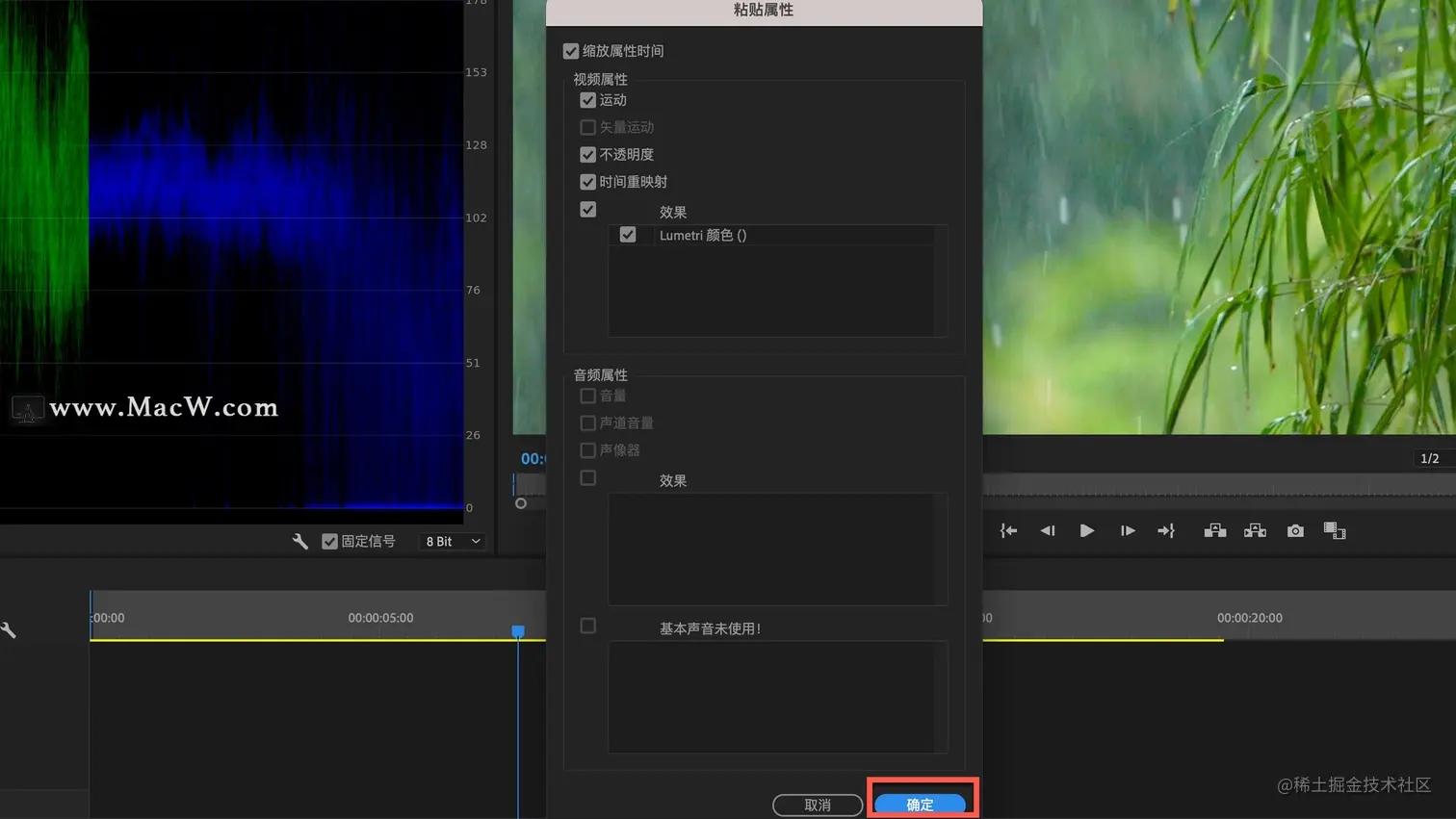 一般在调色的时候,基本上每个镜头都需要调节,但如果是同类的画面或者是同一个素材的不同拍摄角度,就可以先调整好一个素材,在素材上同时按住command+c,然后在另一段素材上单击右键-粘贴属性...