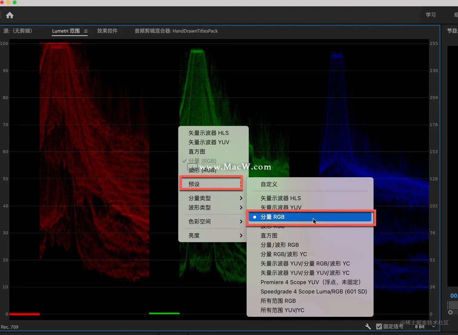 在左侧的lumetri范围右键单击,在预设中选择分量RGB,是比较适合新手使用的模式