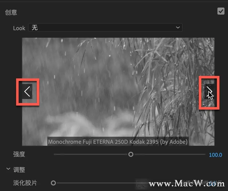 点击缩略图中的左右方向箭头,可以快速预览各种LUT预设效果,在缩略图中双击就可以把当前预设应用到视频中