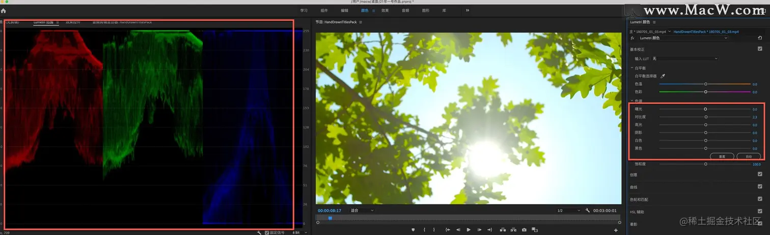 调色一般分为初级调色和二级调色,初级调色就是简单调节画面中的曝光,颜色偏差阴影以及高光等,二级调色是对视频中的画面局部进行调节,例如我们调节选择某个视频片段来进行调节,在右侧lumetri颜色找到并展开基本校正,在色调中可以进行细致的调节,例如曝光、高光、阴影等效果,相对应的lumetri范围中的数值也会根据调节而变化