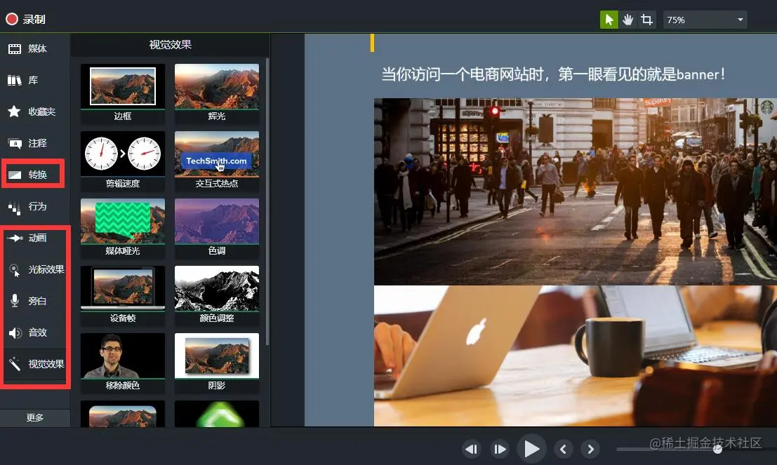 可以录屏的软件有很多,Camtasia和普通的录屏软件有什么不同?它可以添加注释、旁白以及光标效果的方式来强调重点内容。还可以添加转换、动画、以及视觉效果等,这些能让自己的网课视频在众多同类作品中脱颖而出。