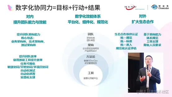 本次分会场上,猪齿鱼总经理刘福东先生首先分享了汉得在云原生效能方面的观察和实践。由于疫情原因,刘福东先生以远程的方式发表演讲。他指出,在当前行业趋势和人口红利降低的社会背景下,企业在数智化进程中有更多新的思考和应对之举,而云原生从计算云原生、架构云原生和开发云原生等方面则为企业数字化建设提供了有效的参考途径。数字化转型是数字化与转型的结合,其本质在于数字化协同力的构建,包括目标、行动和结果。而构建数字化协同力,需要从战略规划、组织能力、研发体系、企业级架构、方法论、效能工具等多方面,体系化、系统化地进行思考和推进。猪齿鱼作为一款数智化效能平台,则能够传递体系化方法论,并提供协作、测试、DevOps及容器工具,从团队、架构、方法论、产品等层面帮助团队效能更快更强更稳定,有力地助推企业数智化建设。