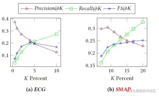 我们还在 ECG 与 SMAP 两个数据集上对对离群点的比例 K_K_ 做了敏感度分析,发现在 ECG 数据上,K 选 5 效果最好,而在 SMAP 数据上,K 选 12 效果最优。