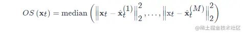 离群点分数计算 为了防止过拟合,我们采用多个模型计算出来的离群点分数\mathcal{OS}(x_t)OS(_xt_)的中位数作为最终的离群点分数。