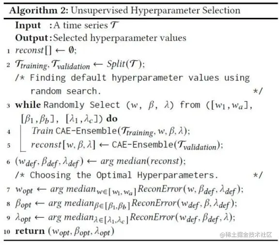 本文有三个重要的超参:滑动窗口大小 w_w_,参数转移比例\beta_β_,平衡参数\lambda_λ_,由于我们的方法是无监督的,首先,我们将划分无标签的训练集和验证集,然后我们为这三个参数设定一个范围,然后利用随机搜索,通过最小化重构损失确定一个最优的超参组合,,其中利用重构损失可以使得我们的算法不需要标签,达到无监督的作用。同时,在寻找某个参数的最优值的过程中,我们会将另外两个参数固定在默认值。具体算法如下图所示。