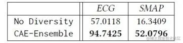 同时,我们去除了模型的多样性部分,并与完整的模型进行对比,发现 CAE-Ensemble 模型在多样性方面远远超过去除多样性的模型。