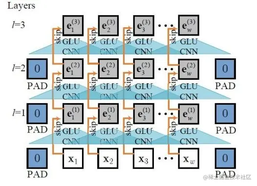在编码阶段,编码器采用堆叠的卷积层学习时间序列的时序特征,下图给出了一个由三层卷积网络组成的编码器示例。
