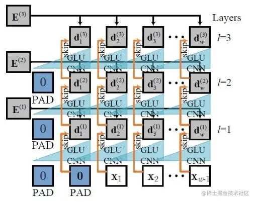 解码器与编码器类似,但存在轻微的不同,我们利用 padding 的方式确保在 t_t_ 时刻的输入不晚于 t_t_,下图给出了一个由三层卷积网络组成的解码器示例。