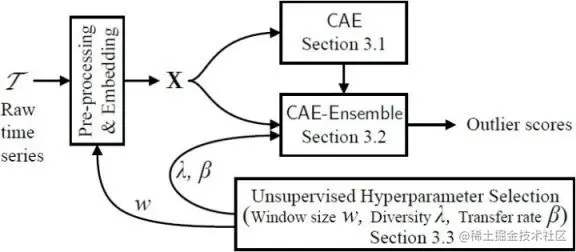 CAE-ENSEMBLE 算法设计如下图所示,包含数据预处理、集成的 CAE 模型和无监督超参选择三部分,我们将从这三部分分别介绍本模型。