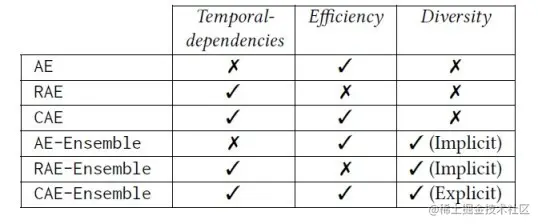 本文提及了 6 种编码器:普通自动编码器 AE(由全连接层组成)、基于 RNN 的自动编码器 RAE、基于 CNN 的自动编码器、集成的普通自动编码器 AE-Ensemble、集成的基于 RNN 的自动编码器 RAE-Ensemble、集成的基于 CNN 的自动编码器 CAE-Ensemble。这六种编码器在建模时间依赖、效率和多样性方面的区别如下图所示。