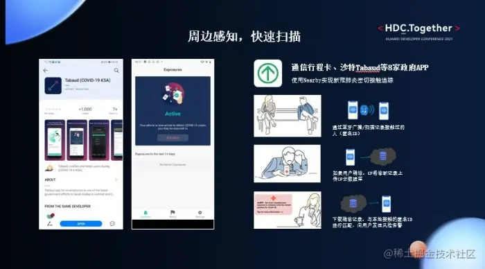 这一块服务其实我们推出了将近两年。中国范围内的通信行程卡接入了该服务,相信各位来宾光临松山湖的时候已经用到了它;国外,目前我们也接入了8个国家的政府类应用(App)。这些都需要近距离通信服务中的周边感知能力。比如在运动场景下,一个用户移动时间为14秒,距离大概15到25米,手机、手表等亮屏识别成功率达到80%。即使这些设备熄屏,近距离通信服务也能够进行周边感知,准确率达20%以上。