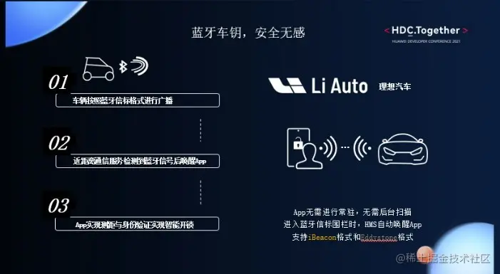 近距离通信服务还可以应用于智能汽车场景。在座的各位有开车的,一定是经常用车钥匙,或按一下开关车锁。那么我们怎样让智能汽车做到安全无感的开关车锁呢?理想汽车,一个电动车创业公司并最近于纳斯达克上市,通过近距离通信服务实现了无感蓝牙钥匙功能。汽车按照信标格式进行蓝牙广播,当用户携带手机靠近汽车时,理想汽车App就会被唤醒,同时进行身份认证、距离测量等业务,从而让车辆闪灯欢迎车主,并自动解锁准备出发,体验非常炫。目前,我们跟理想、小鹏等智能汽车都有这方面的合作。