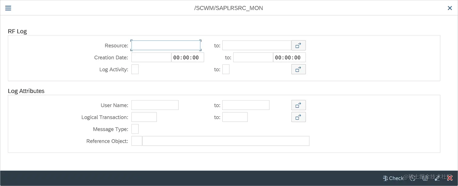 日志由仓库监控中的一个新节点表示(交易**/SCWM/MON**,节点_资源管理→RF日志_)。在选择屏幕上,你可以根据需要的参数进行过滤。