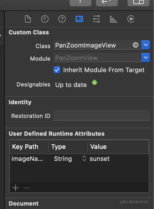 好了,我想我们已经准备好使用我们的新类了!打开Main.storyboard,添加一个视图,以你喜欢的方式把它固定在父视图上。接下来,选择该视图,导航到身份检查器,并将该类设置为PanZoomImageView。