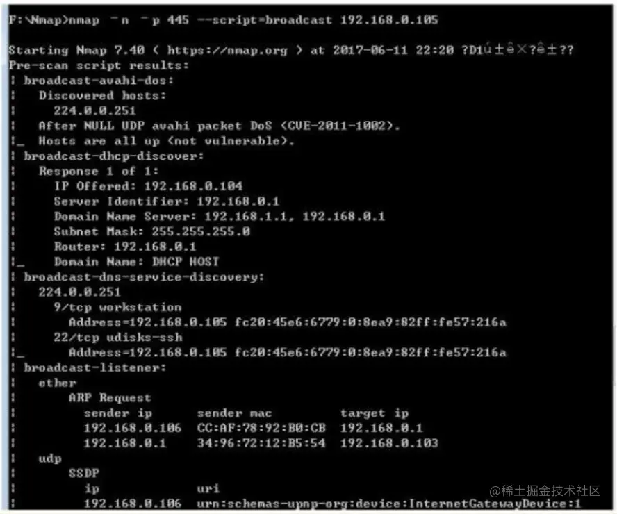 nmap -n-p 445-- script= broadcast 192.168.0.105