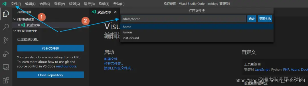 (4)登录成功,即可像操作本地环境一样,在VS Code客户端操作远程云主机上的文件。注意,下图中的「打开文件夹」已经是远端机器上的目录结构了。
