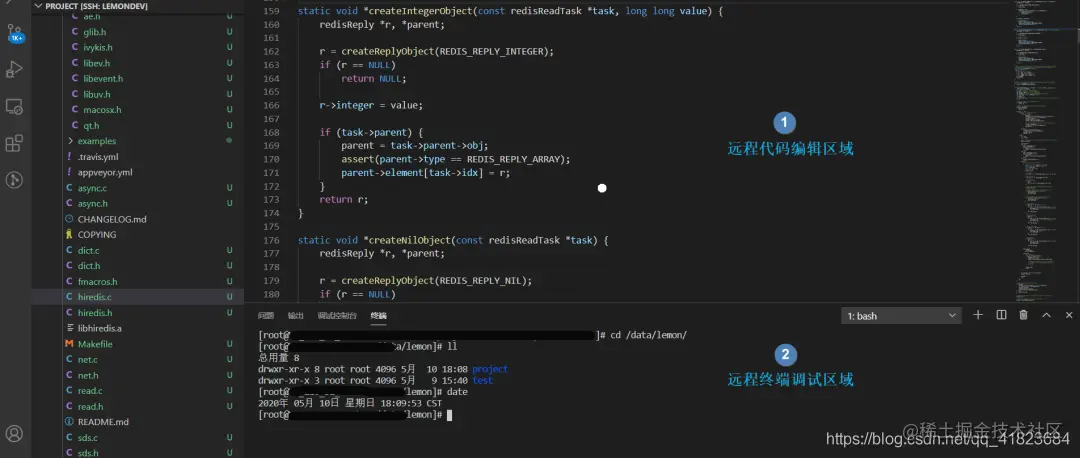 (6)代码编辑与远程终端调试。打开文件编辑的是云服务器的文件,同时可以打开云服务终端,直接在终端操作编译或者查看云服务器信息。