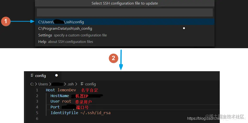 (2)修改 ssh 配置文件,用于登录远程机器,各项含义在图中有说明。