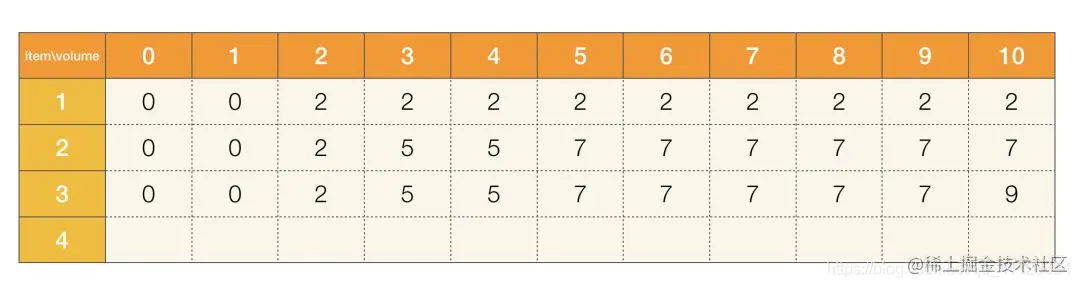 这样,我们就根据物品和体积将问题拆分成子问题,也就是 “前 n 个物品在体积 V 处的最大价值” 可以由 “前 n - 1 个物品的情况” 推导得到。