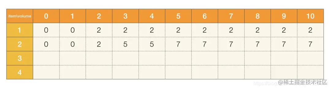 1、如果我们仅考虑将前一个物品放入背包,只要背包体积大于 2,此时都可以获得价值为 2 的最大价值: