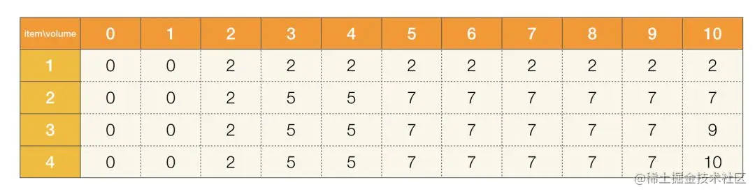 假设背包的大小是 10,有 4 个物品,体积分别是 [2,3,5,7],价值分别是 [2,5,2,5]。
