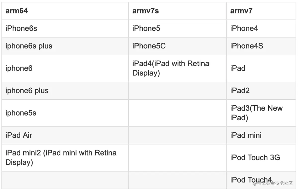 在进行lipo命令前, 必须知道iOS CUP架构有又哪几种, 而相对应的设备又是哪些呢? 给大家一张图进行查看, 这个不用记忆, 遇到了翻出来看看就好了