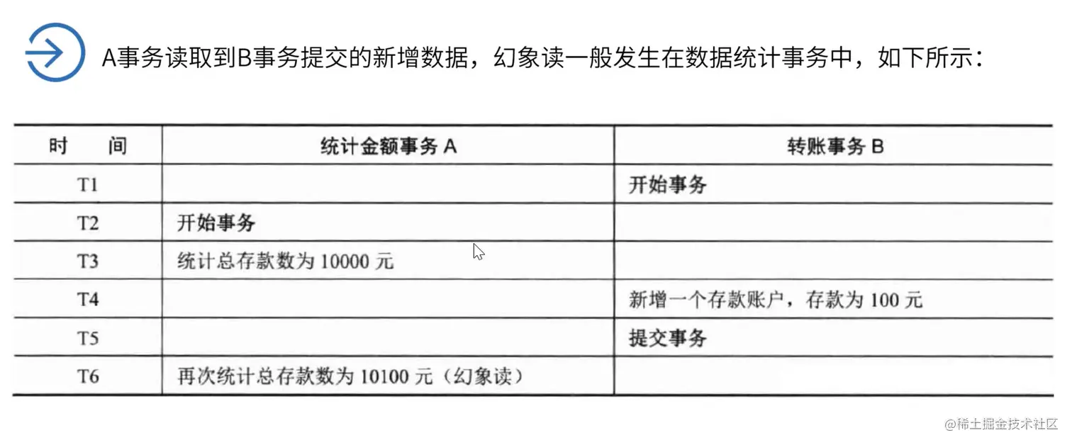 幻读 Phantom Read :指事务读取某个范围的数据时,因为其他事务的操作导致前后两次读取的结果不一致。