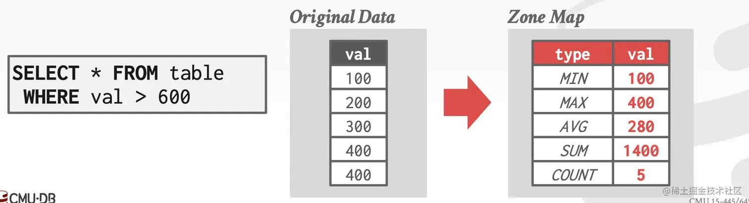 - zone map: 预计算每个page的一些聚集计算结果,来粗粒度的判断这个page中是否可能包含所需的数据: