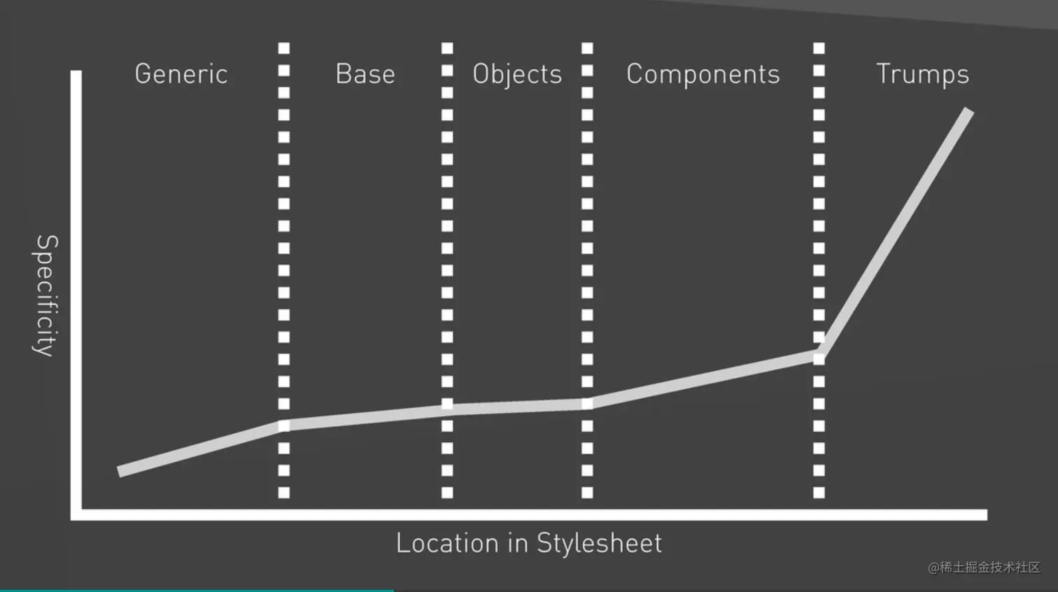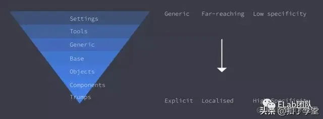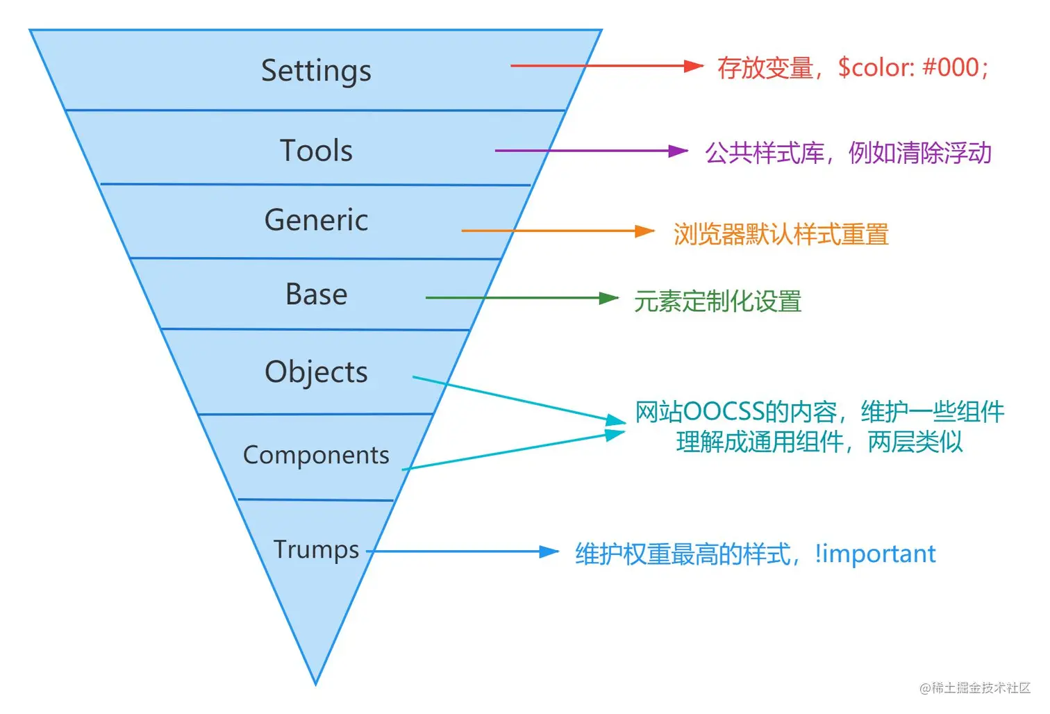 ITCSS:本质是一种思想,按照选择器个性化的程度,将它归类在某一层(越往下个性化级别越高)。整个页面的样式分为了多个层级,每个样式必须写在符合它个性化级别的位置(层级)。