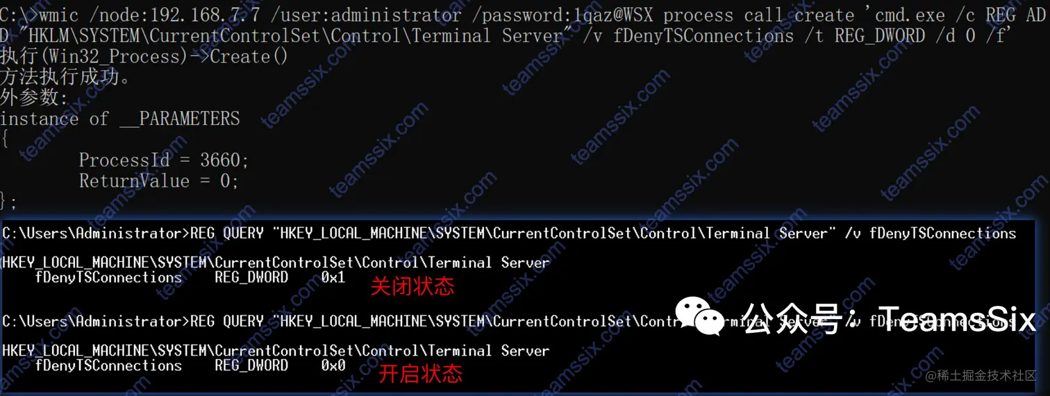 wmic /node:192.168.7.7 /user:administrator /password:1qaz@WSX process call create 'cmd.exe /c REG ADD "HKLM\SYSTEM\CurrentControlSet\Control\Terminal Server" /v fDenyTSConnections /t REG_DWORD /d 0 /f'