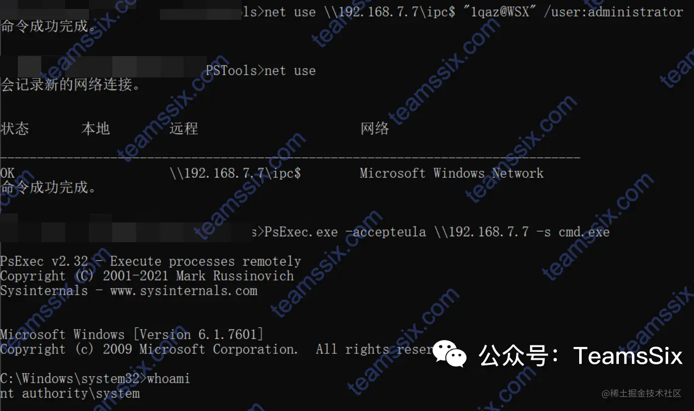如果没有建立 ipc$ 连接,也可以直接使用 PsExec 指定用户名密码进行连接