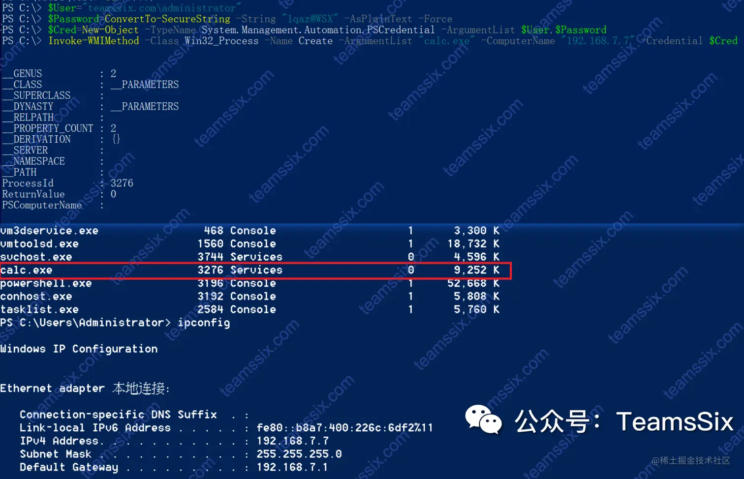 可以看到在 192.168.7.7 主机中已经有进程 ID 为 3276 的 calc.exe 被执行了。