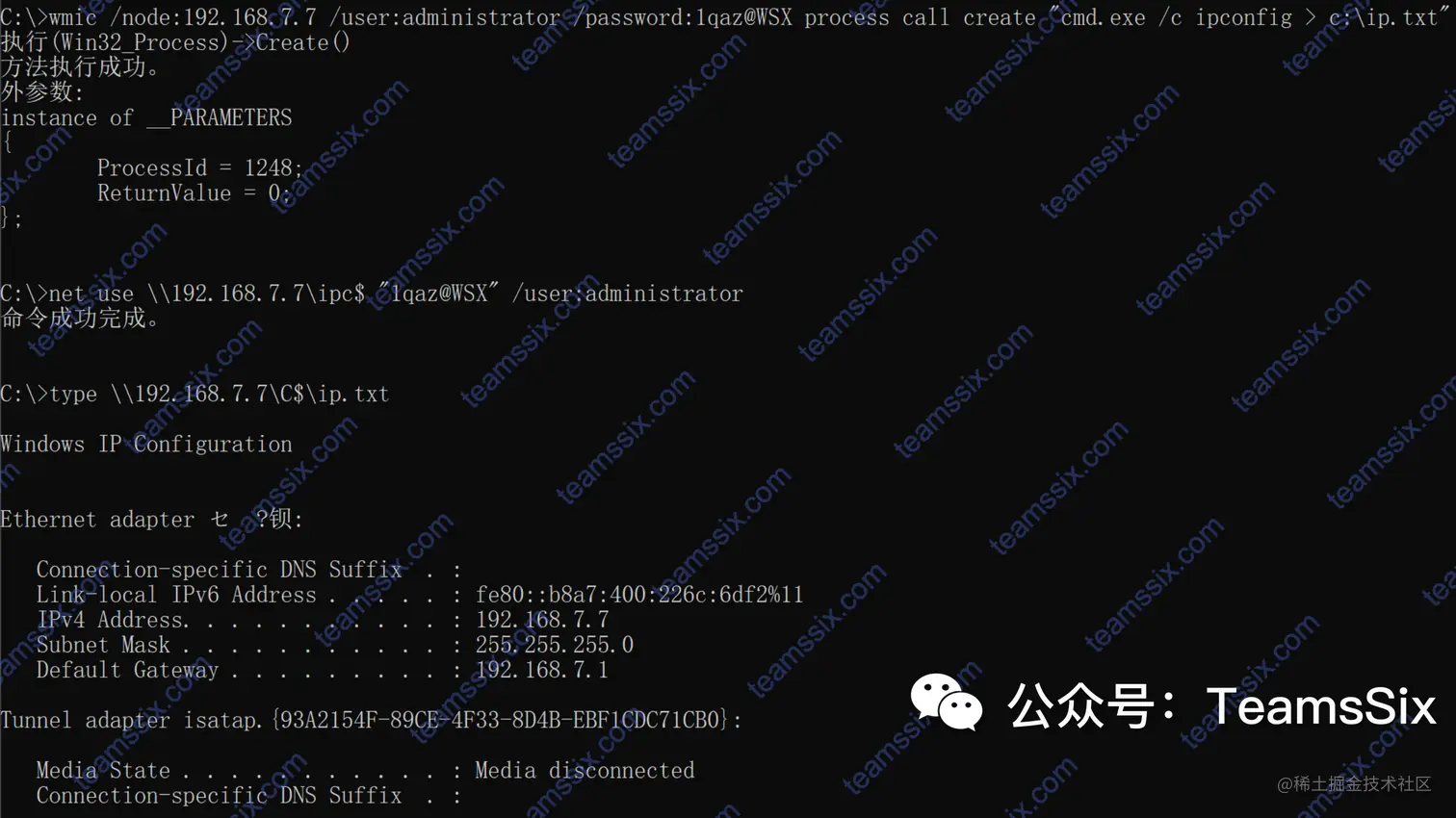 wmic /node:192.168.7.7 /user:administrator /password:1qaz@WSX process call create "cmd.exe /c ipconfig > c:\ip.txt"