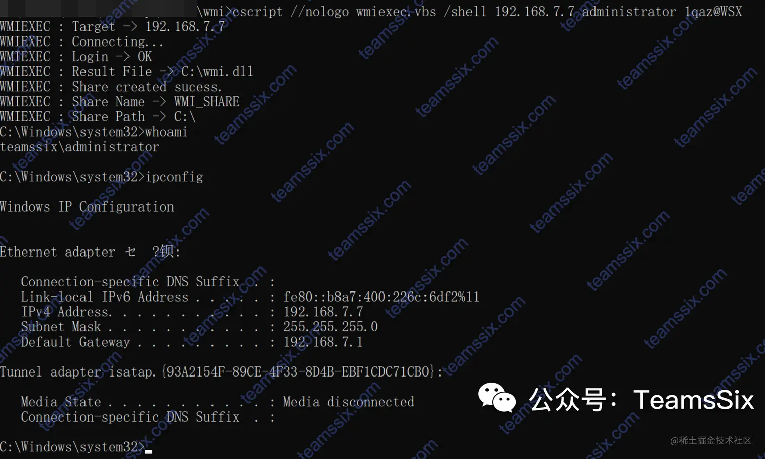 cscript wmiexec.vbs /cmd 192.168.7.7 administrator 1qaz@WSX "ipconfig"
