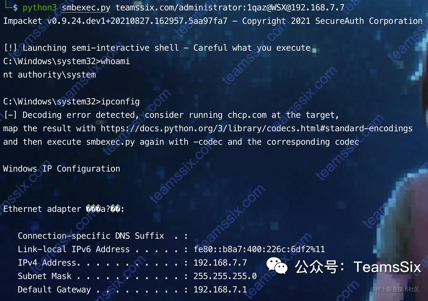 python3 dcomexec.py teamssix.com/administrator:1qaz@WSX@192.168.7.7 ipconfig