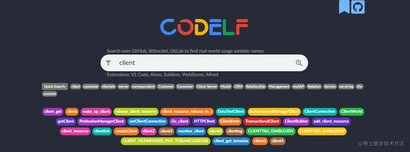 最后给大家推荐一个在线命名神器。大家快去试试吧,随便输入一个单词,便会给你搜索很多由该单词组成的词。unbug.github.io/codelf/#cli…